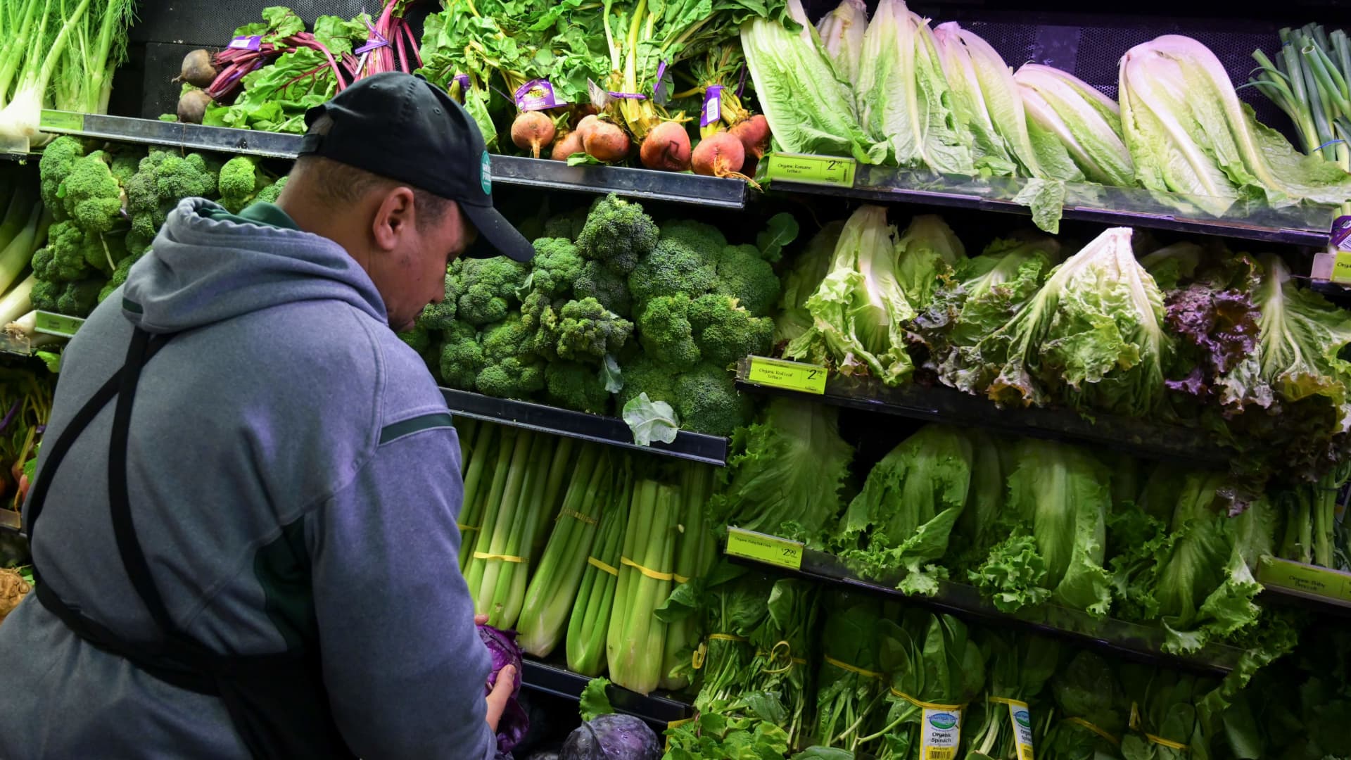 A produce worker stocks a shelf near romaine lettuce (top shelf, right) at a Washington, D.C., supermarket on November 20, 2018.
