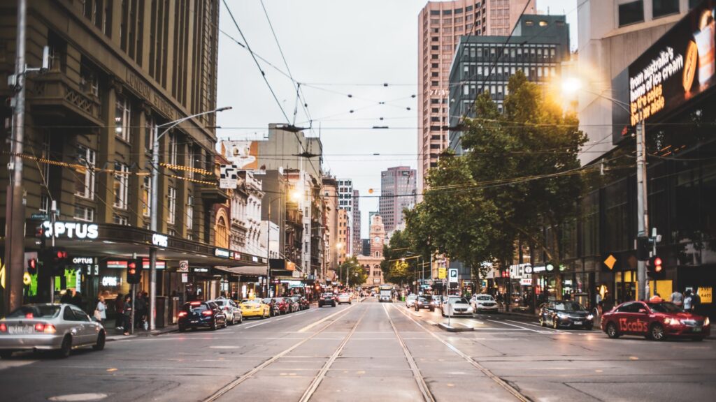 Activities on Elizabeth Street (at the intersection of Bourke Street Mall) in Melbourne on a cloudy day.