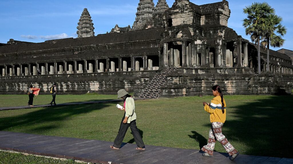 This photo taken on December 18, 2025 shows tourists visiting the Angkor Wat temple in Siem Reap province. Cambodia’s biggest tourist attraction, a centuries-old stone structure, has become unusually quiet and business is in a desperate situation as travel cancellations due to the border dispute between Thailand and Cambodia have left Cambodia’s biggest tourist attraction, a centuries-old stone structure, unusually quiet. (Photo provided by TANG CHHIN Sothy / AFP via Getty Images) / To Suy SE’s “CAMBODIA-THAILAND-CONFLICT-TOURISM,FOCUS”
