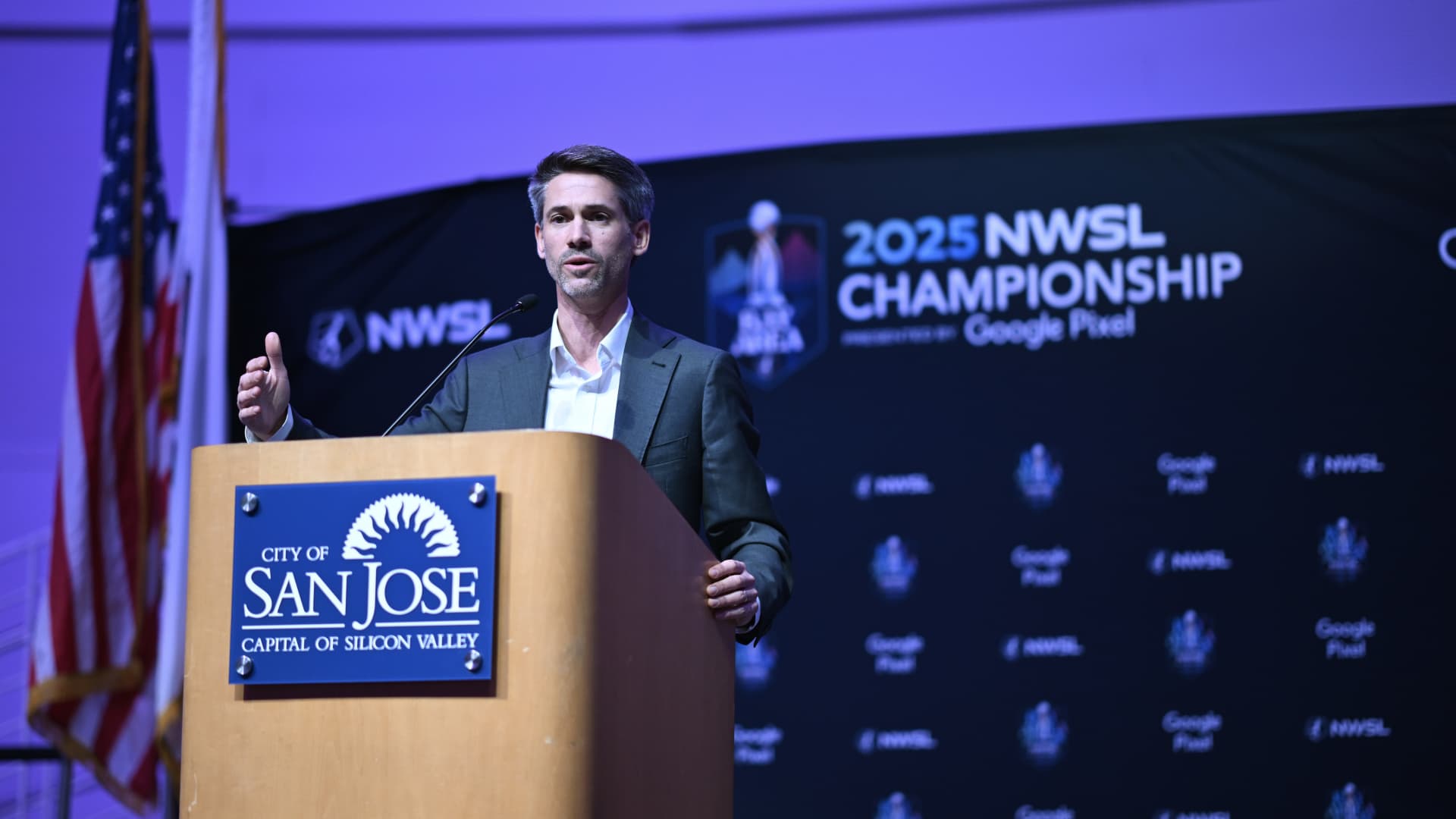 San Jose Mayor Matt Mahan speaks at the NWSL Championship Welcome Reception in the Rotunda of City Hall on November 20, 2025 in San Jose, California.