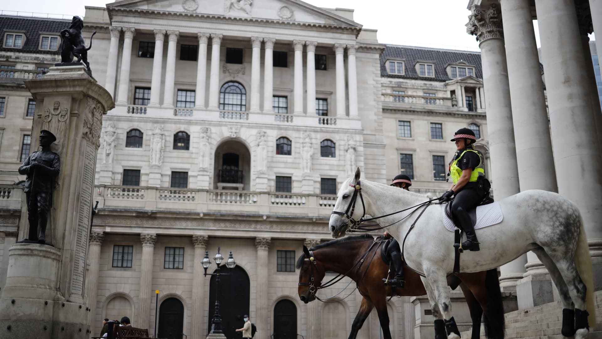 Mounted police sit outside the Royal Exchange and Bank of England on June 17, 2020 in London.