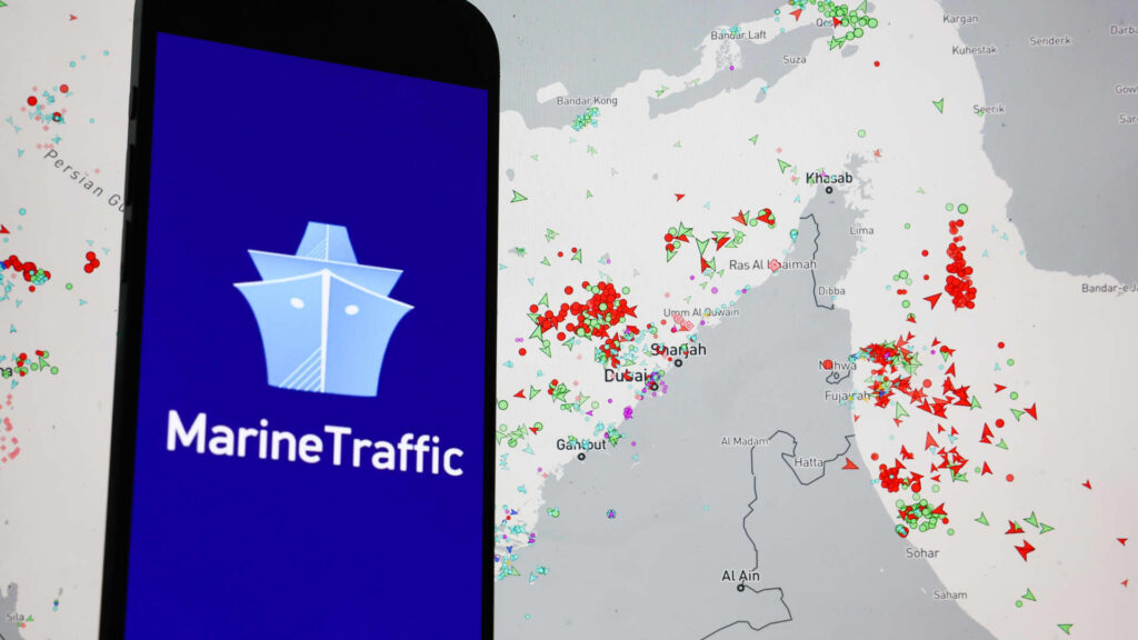 This illustrated photo taken on March 5, 2026 in Krakow, Poland, shows a MarineTraffic map showing current shipping traffic in the Strait of Hormuz displayed on a laptop screen and the MarineTraffic logo displayed on a mobile phone screen.