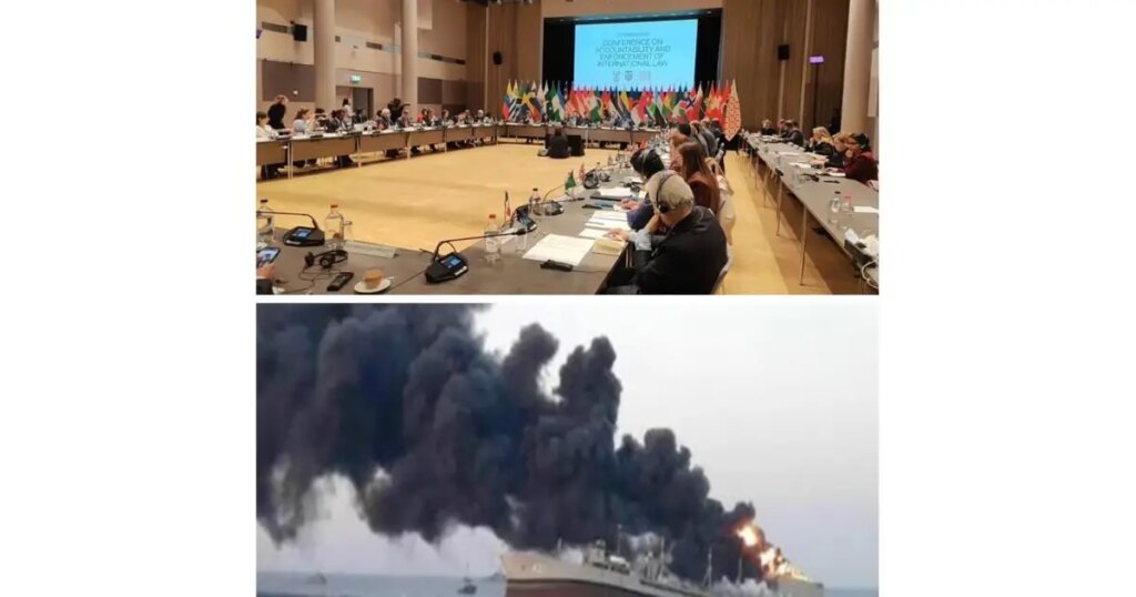 In that context, juxtaposing sinking warships with images of diplomats and experts is much more than an abstract provocation. Comparisons are made between military targets and participants in the International Law Compliance Conference.