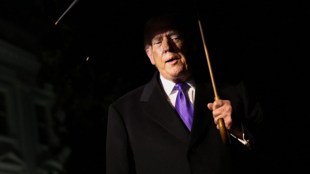 US President Donald Trump speaks to members of the media while holding an umbrella as he leaves the White House on his way to Florida on January 9, 2026 in Washington, DC, USA.