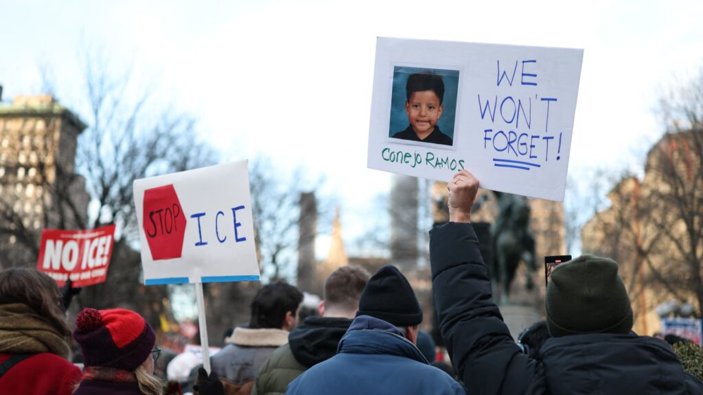 People hold a photo of Liam Conejo Ramos, a 5-year-old boy who was detained by immigration officials during the ICE Out protest against U.S. Immigration and Customs Enforcement (ICE) in New York on January 23, 2026. Demonstrations against ICE have expanded dramatically as the Trump administration moves to crack down on illegal immigrants following the January 7 killing of ICE officer Renee Nicole Good, 37, in Minneapolis. (Photo by ANGELA WEISS/AFP via Getty Images)