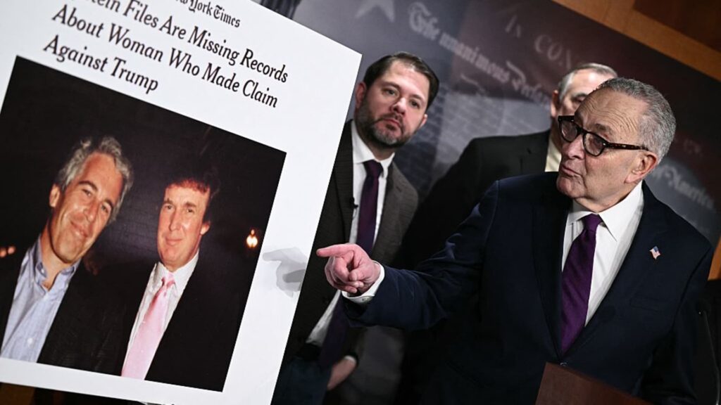 A sign with a photo of U.S. President Donald Trump and Jeffrey Epstein is held up as Senate Minority Leader Chuck Schumer (D-N.Y.) speaks at a press conference announcing surveillance efforts on convicted sex offender Jeffrey Epstein’s file at the U.S. Capitol in Washington, DC, on February 26, 2026.