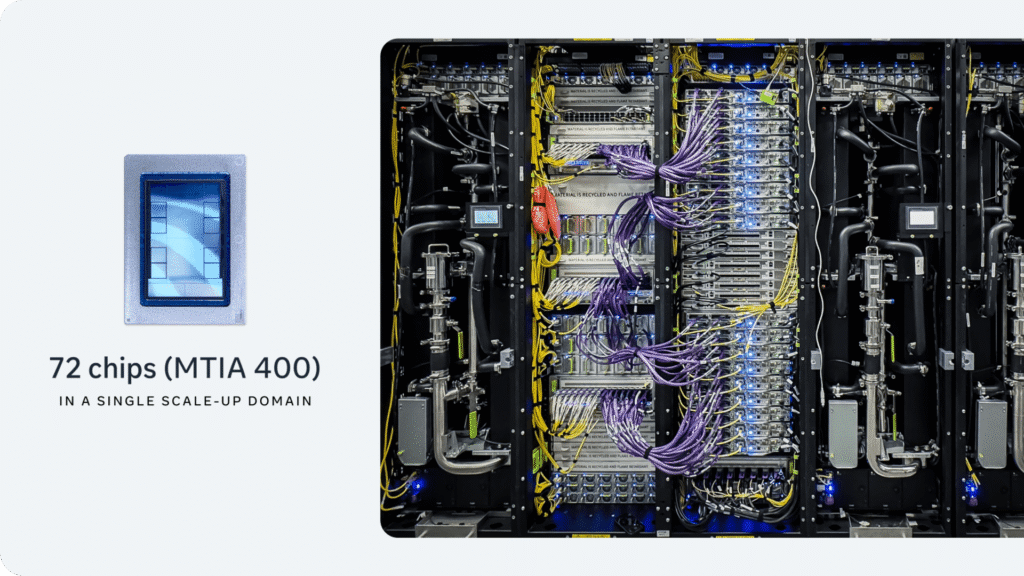 One Meta data center rack is equipped with 72 of Meta’s in-house MTIA 400 chips, which are optimized to accelerate AI inference. MTIA 400 has completed its testing phase and will be deployed to Meta Data Centers soon.