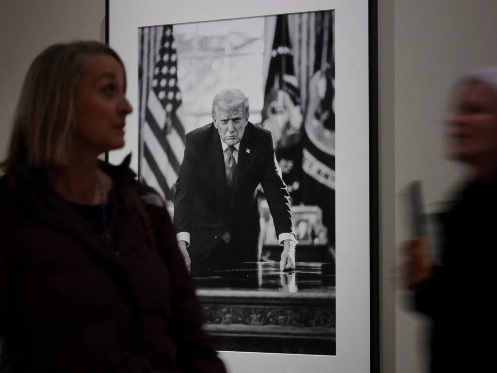 The image is a reproduction of a black-and-white image of Trump taken by photographer Daniel Torok and displayed at the National Portrait Gallery in Washington, D.C.
