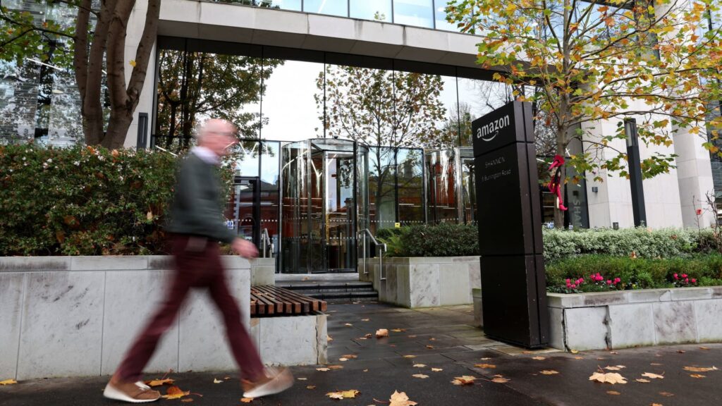 DUBLIN, IRELAND (October 28, 2025) A pedestrian walks past the Amazon Ireland corporate offices in Dublin, where Amazon.com announced on Tuesday that it plans to cut its global corporate workforce by up to 14,000 people and seize opportunities presented by artificial intelligence (AI). October 28, 2025.