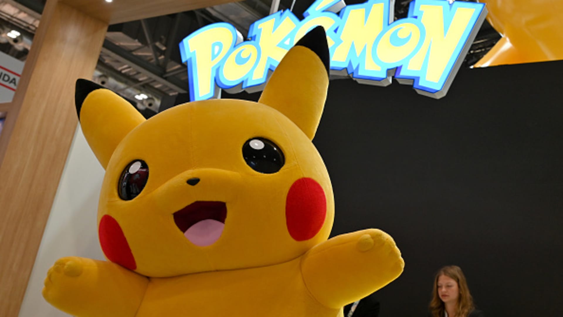 The Pikachu character poses at a Pokémon stand during Brand Licensing Europe at Excel on October 4, 2023 in London, England.
