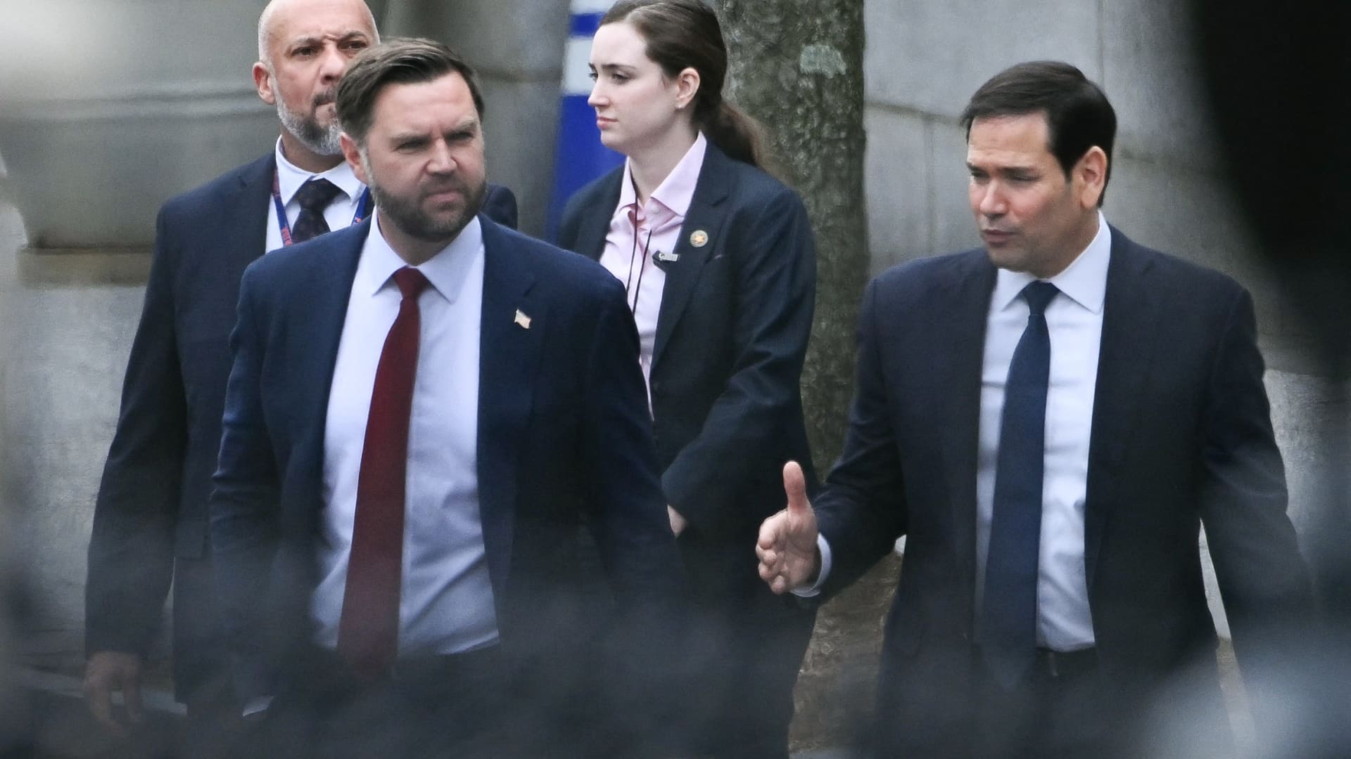 (L/R) U.S. Vice President J.D. Vance and Secretary of State Marco Rubio depart from the Eisenhower Executive Office Building on the White House campus after meeting with Danish Foreign Minister Lars Lökke Rasmussen and Greenlandic Foreign Minister Vivian Motzfeld in Washington, DC, January 14, 2026.