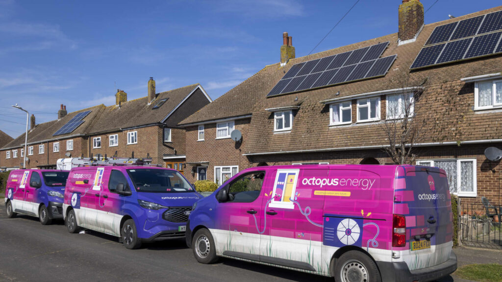 An Octopus Energy branded electric car is parked in front of a modern suburban house in Folkestone, England on March 19, 2025. The home has rooftop solar panels, highlighting its commitment to renewable energy. This scene represents the growing adoption of sustainable energy solutions, with Octopus Energy playing a key role in accelerating the integration of electric mobility and solar power generation. (Photo credit: Andrew Aitchison / Photo via Getty Images)