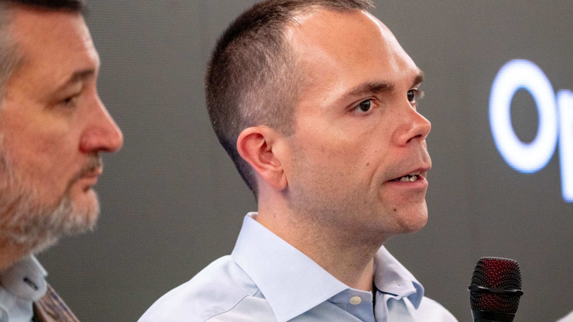 Oracle CEO Clay Magouik (center) speaks during a media tour of the Stargate data center in Abilene, Texas, on September 23, 2025. Stargate is a joint venture between OpenAI, Oracle, and SoftBank that is building data centers and other artificial intelligence infrastructure across the United States with promotional support from President Donald Trump.