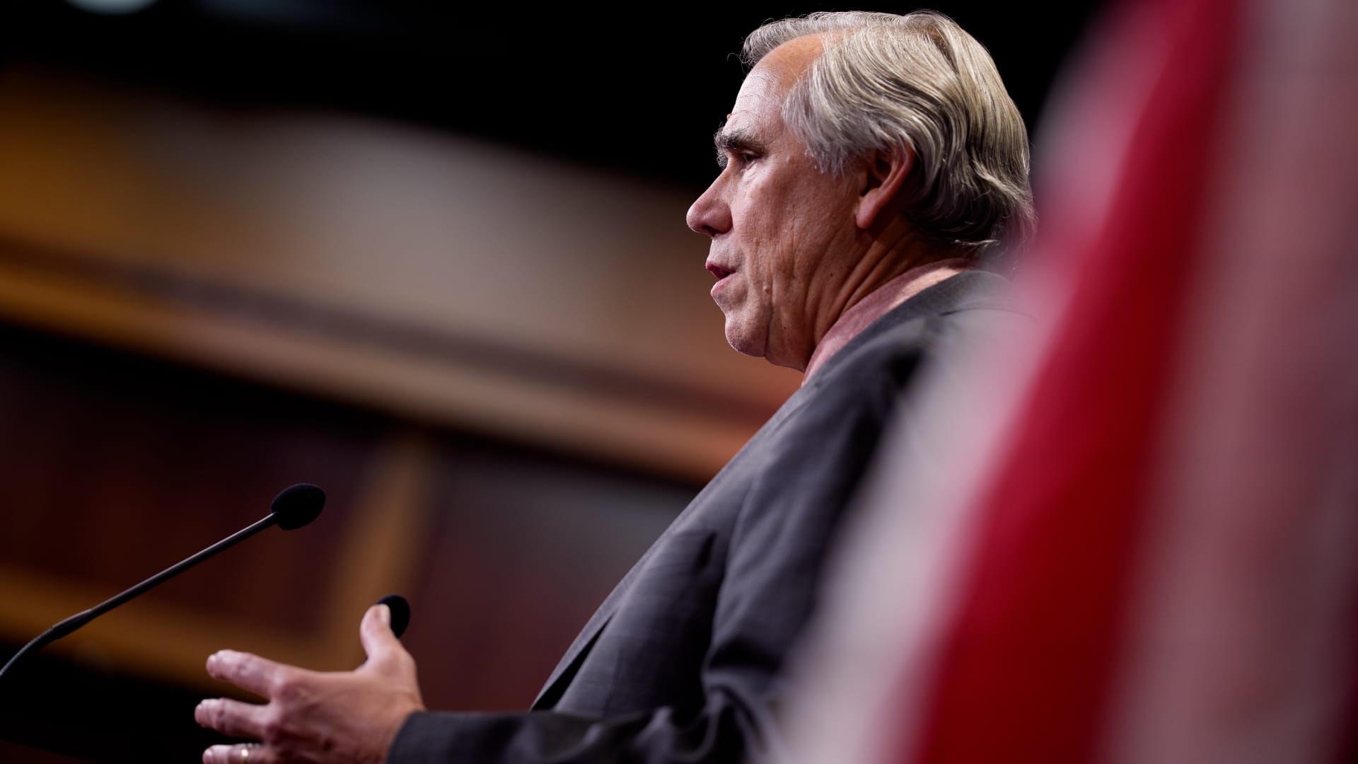 Sen. Jeff Merkley (D-Ore.) speaks during an overnight marathon speech press conference in the Senate chamber of the U.S. Capitol on October 22, 2025, in Washington, DC.