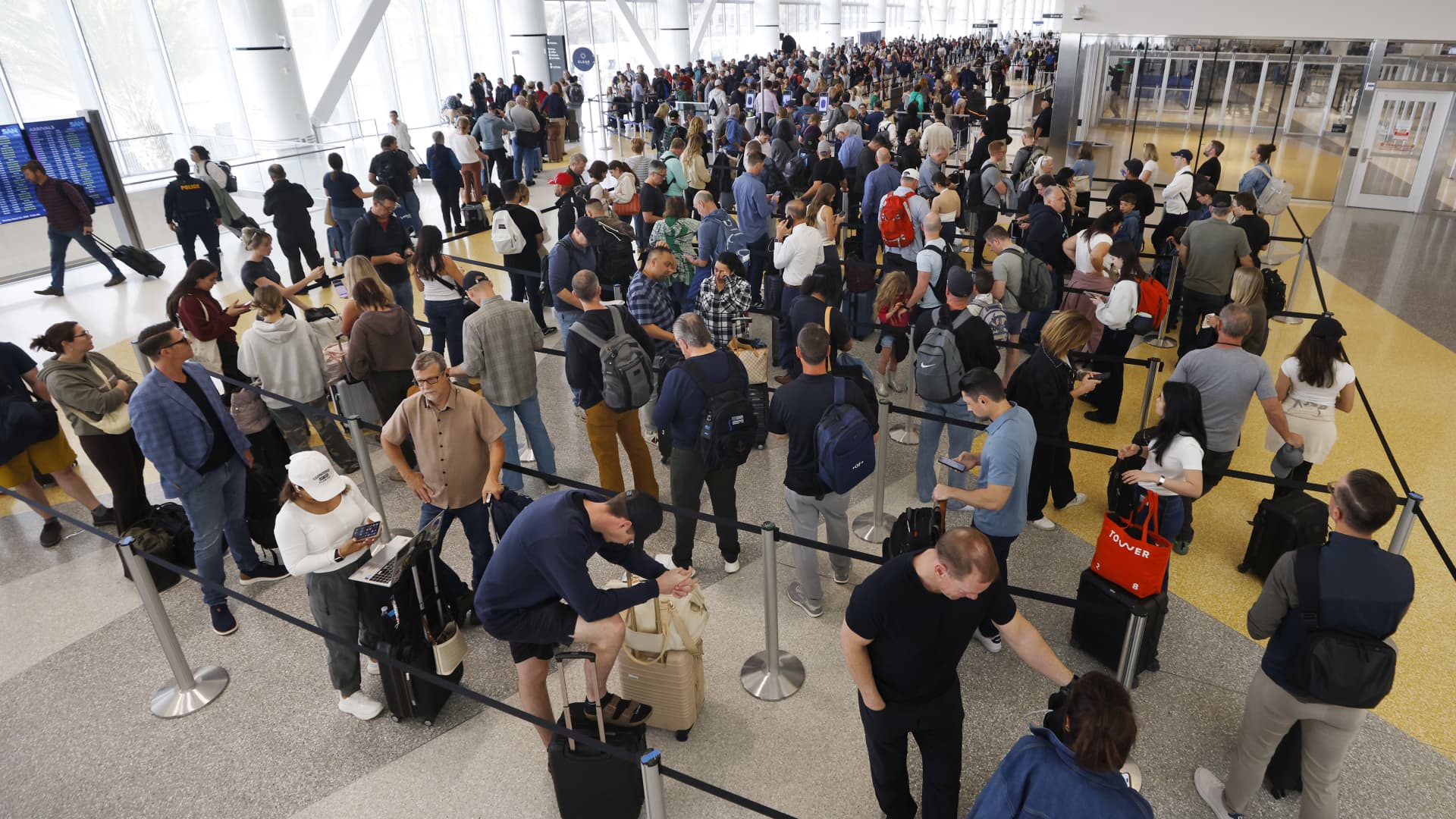 SAN DIEGO, CA – MARCH 23: Travelers wait in a long Transportation Security Administration (TSA) line that wraps around Terminal 1 at San Diego International Airport on March 23, 2026 in San Diego, California.
