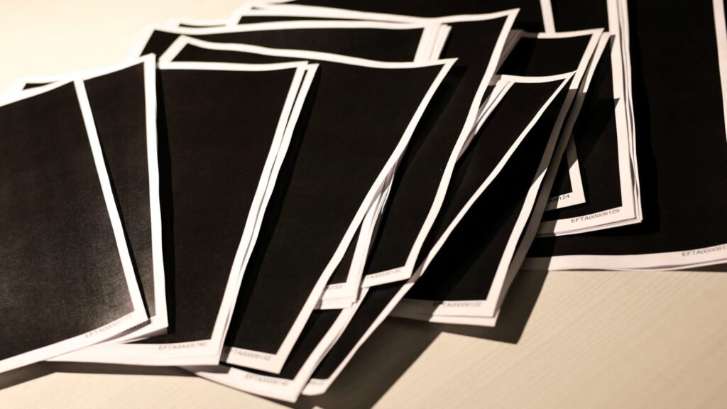 Newly released documents from the late disgraced financier and sex offender Jeffrey Epstein, including a bunch of completely redacted pages, are seen in a handout released by the Justice Department and printed and organized for photos by Reuters in Washington, Dec. 19, 2025.