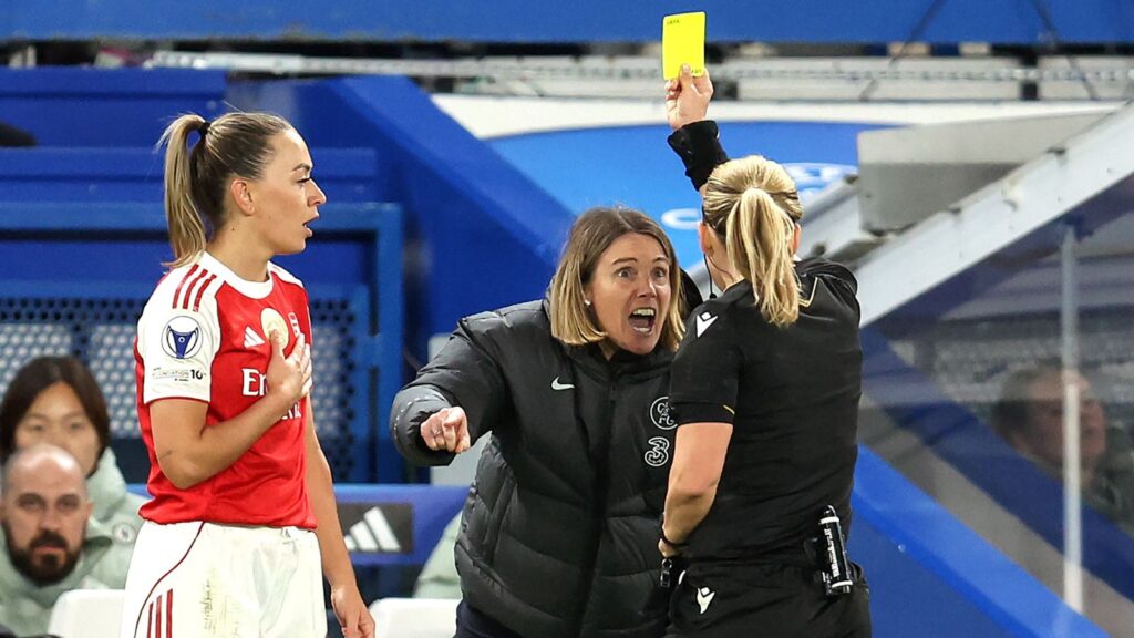 Sonia Bompastre once again targeted VAR after the system failed to review Katie McCabe’s red card for pulling Alyssa Thompson’s hair, and the Chelsea manager was booked and sent off.