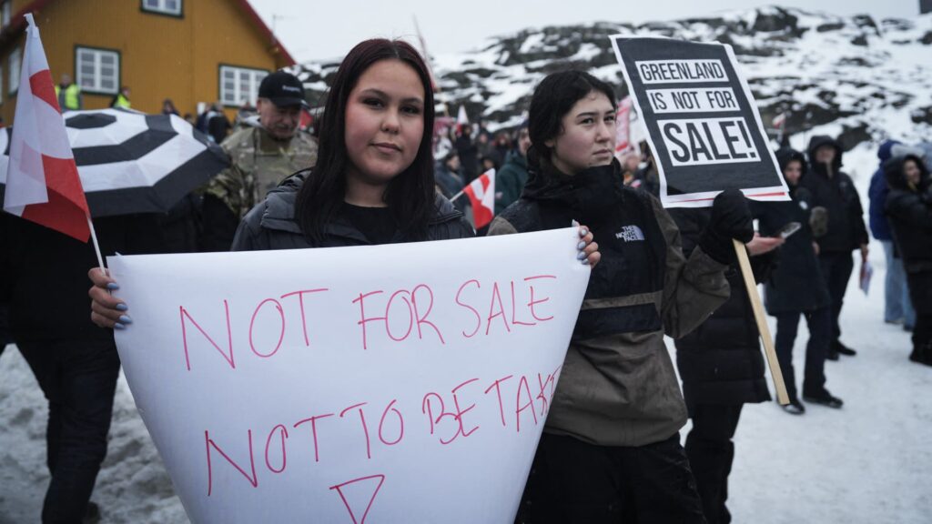 Young people holding placards that read “Greenland is not for sale!” On January 17, 2026, nearly one-third of the city’s population took part in a demonstration in Nuuk, Greenland, near the U.S. Consulate General in Greenland, to protest the U.S. President’s plans to occupy Greenland.