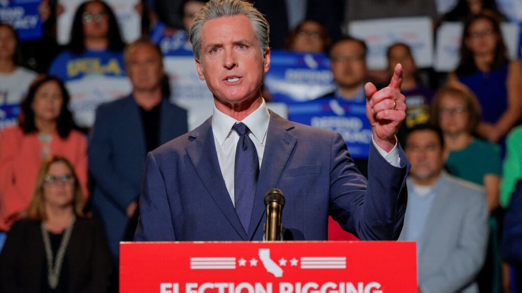 California Governor Gavin Newsom and local legislators, state officials and advocates speak to announce the redrawing of California’s state legislative map and call for approval of a ballot measure, countering a similar move in Texas backed by US President Donald Trump, on August 14, 2025, in Los Angeles, California.
