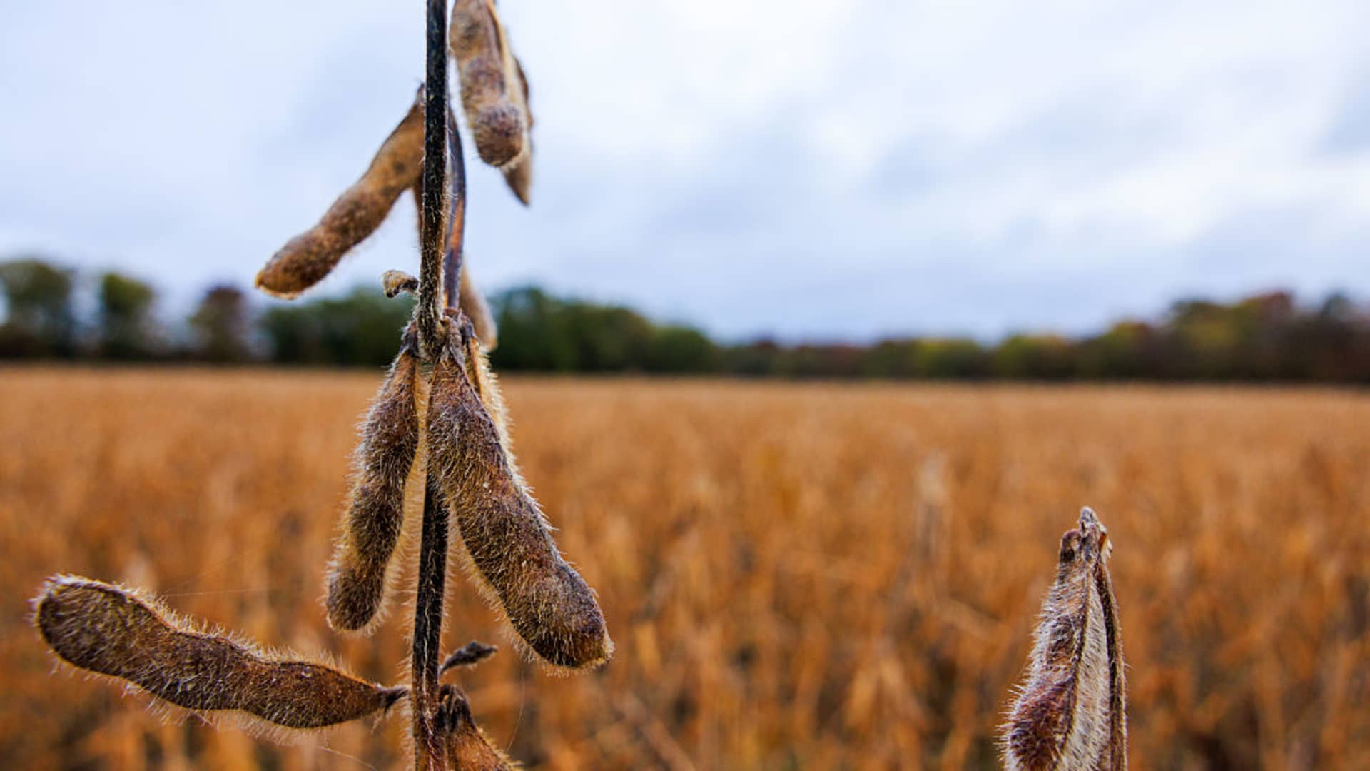 Mature soybeans remain unharvested near North Maple Grove Road after rain on October 28, 2025 in Ellettsville, Indiana.