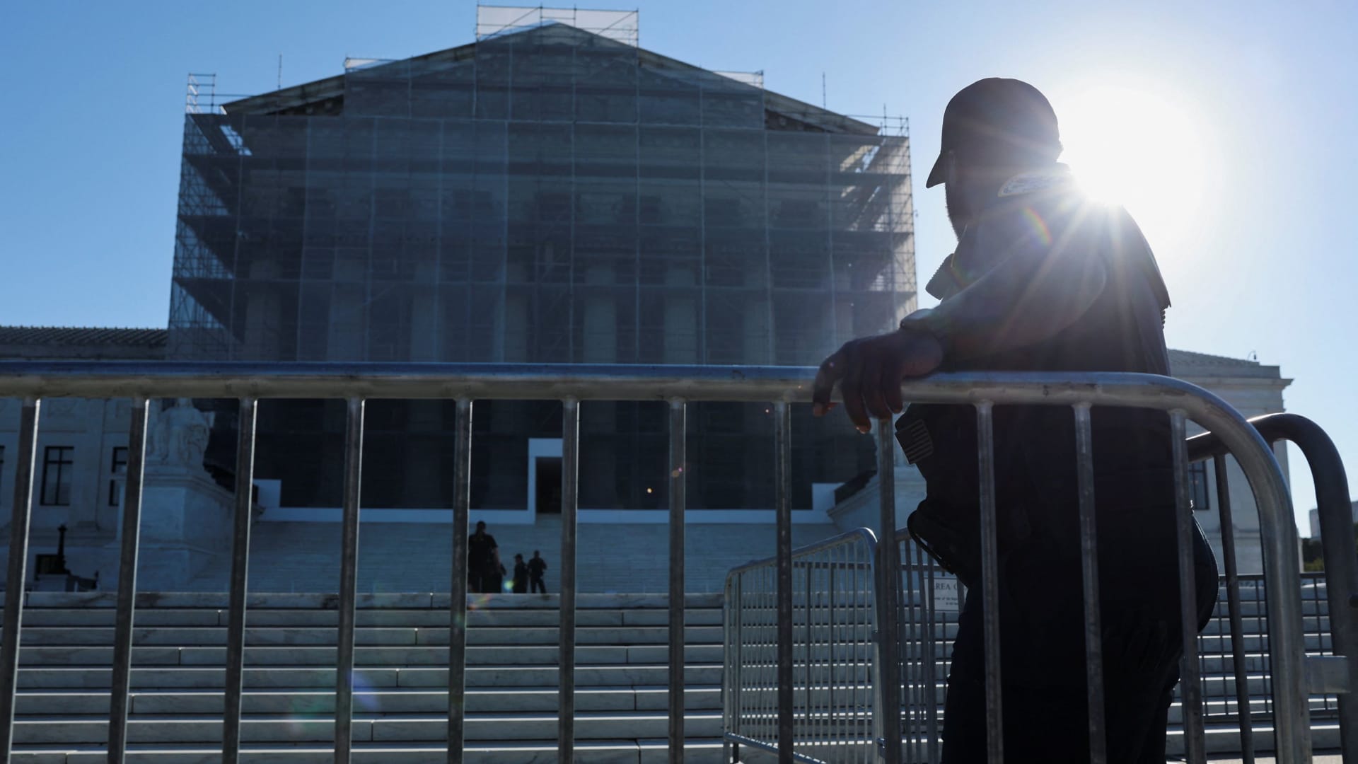 U.S. Supreme Court police officers stand guard during the first day of the new session on October 6, 2025 in Washington, DC, USA.