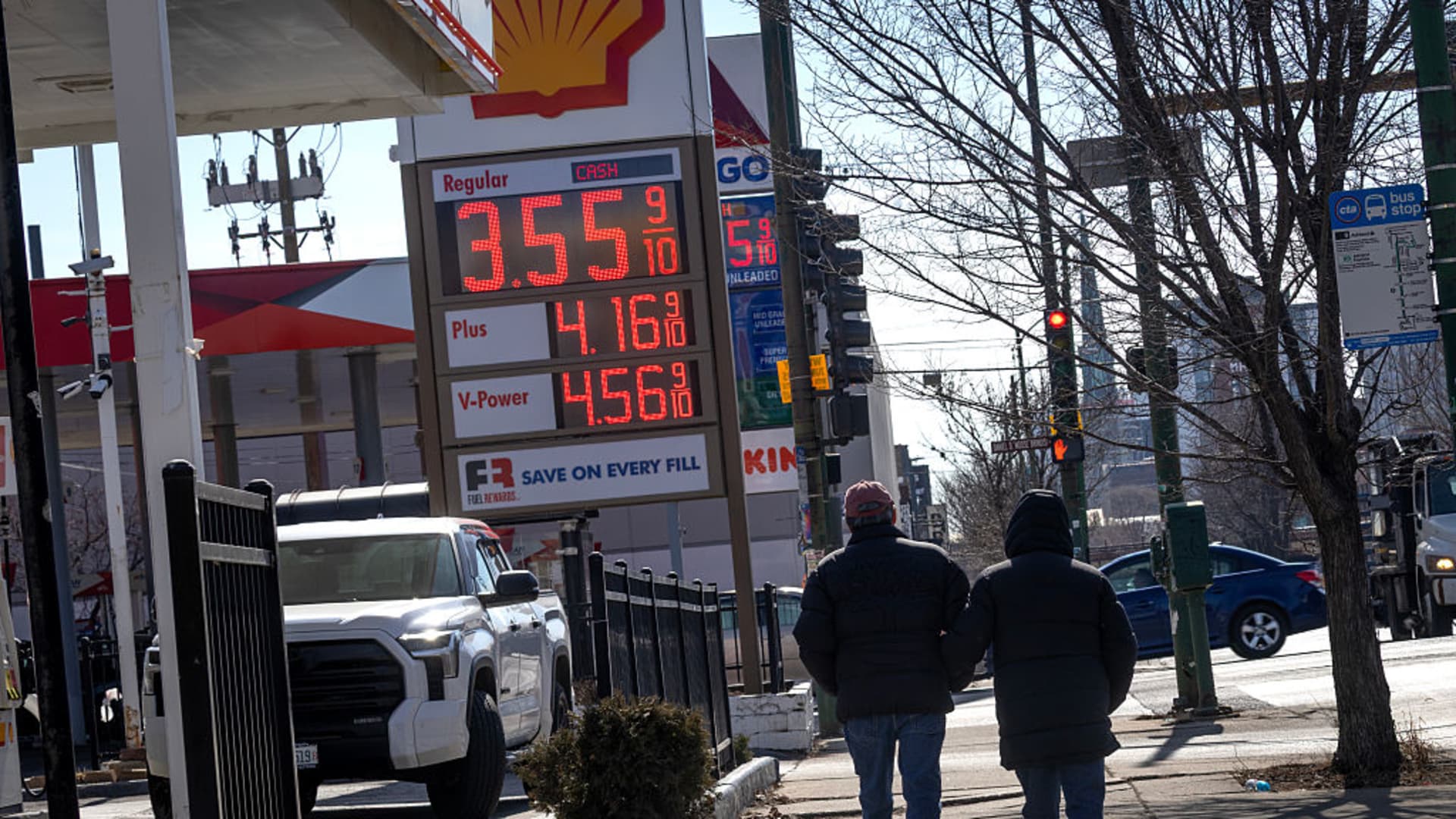 A sign showing gas prices at a station on March 2, 2026 in Chicago, Illinois.