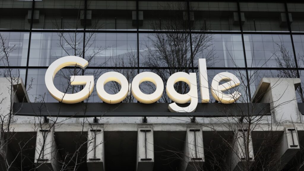 People walk near a sign outside Google’s headquarters in Mountain View, California.