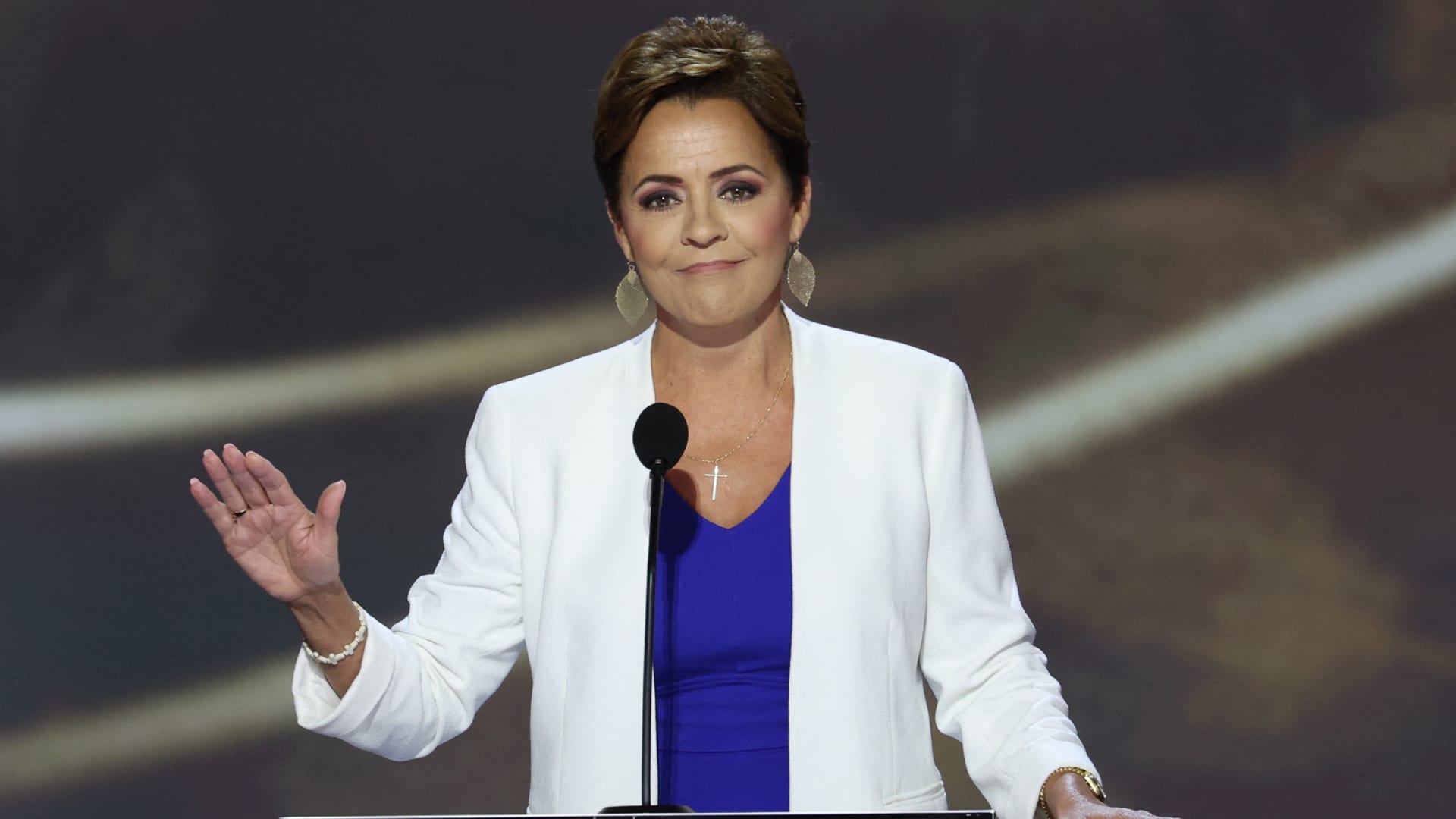 U.S. Senate candidate Kari Lake (R-Ariz.) speaks on the second day of the Republican National Convention (RNC) at the Fiserv Forum in Milwaukee, Wisconsin, U.S. on July 16, 2024.
