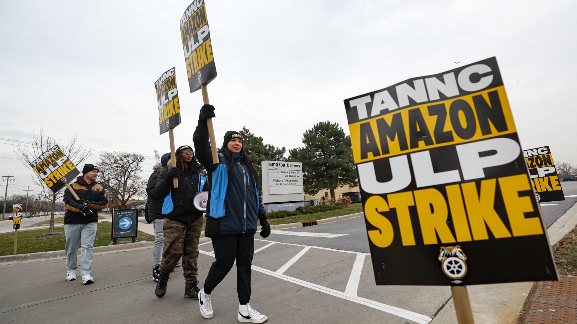 Amazon delivery drivers walk through a picket line outside an Amazon delivery station in Skokie, Illinois, on December 19, 2024.