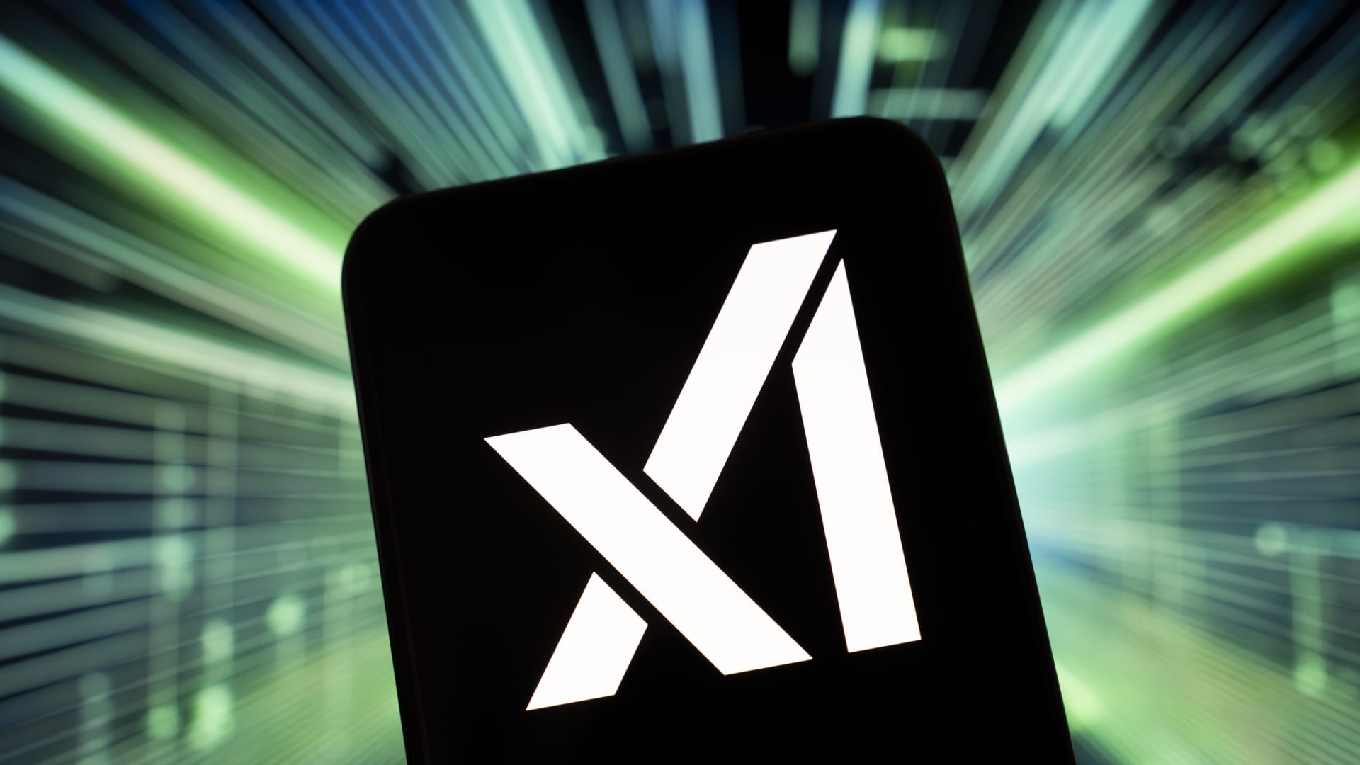 The logo of the artificial intelligence company xAI appears on the smartphone screen against the background of an abstract green illustration. Elon Musk’s Grok, an AI integrated into X, is facing a regulatory crisis after it was able to generate nude images of public figures and minors from a single imported photo in Creteil, France, on January 16, 2026. (Photo illustration by Samuel Boivin/NurPhoto via Getty Images)