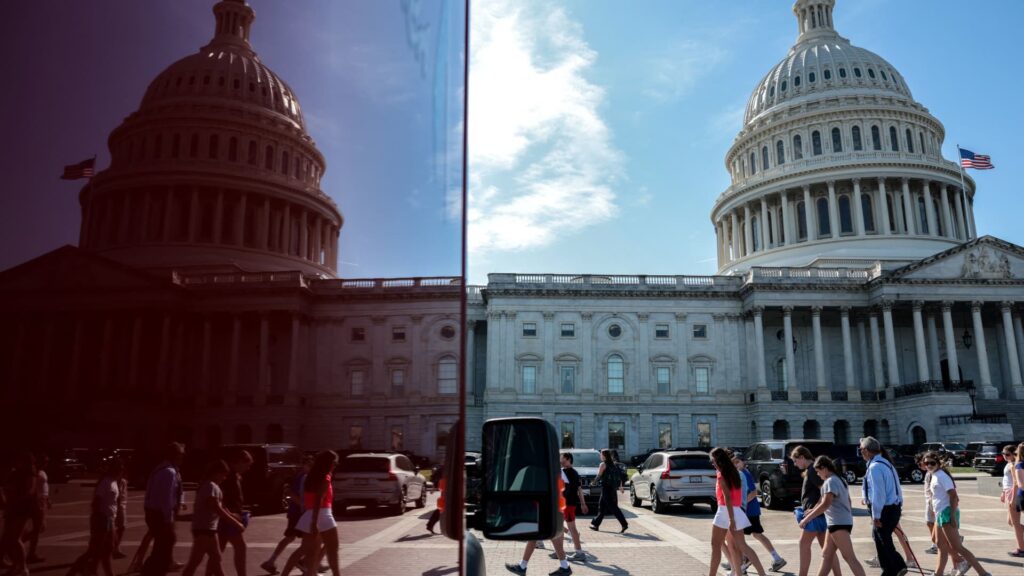Tourists passing by the Capitol Building in Washington, DC, USA, and their reflection in the window of a parked ambulance on April 14, 2026.