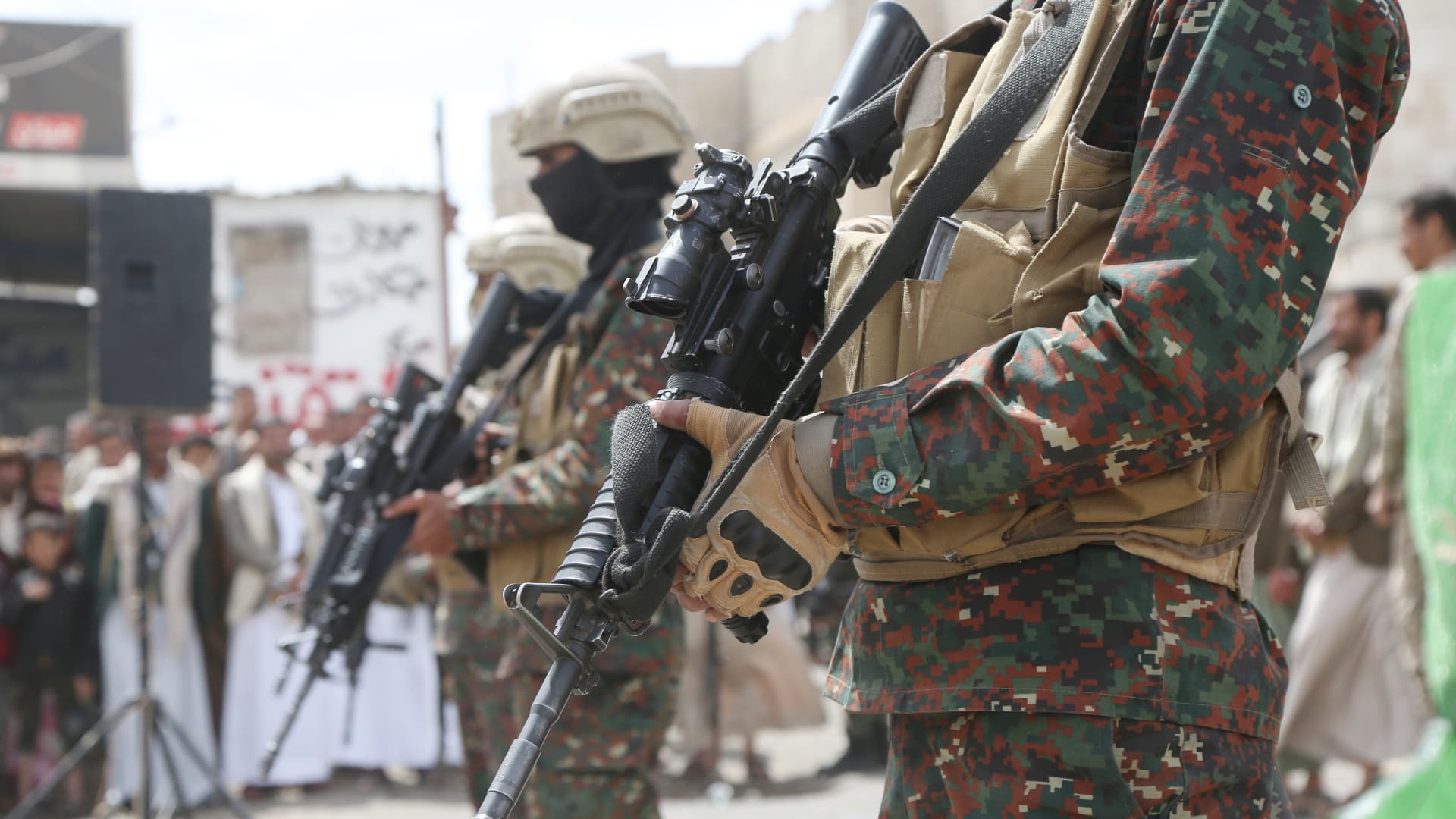 Members of Houthi security forces stand guard against supporters of Yemen’s Houthi movement as they attend a rally to commemorate the 11th anniversary of the military operation launched by the Saudi-led coalition in Sanaa, Yemen, on March 26, 2026.