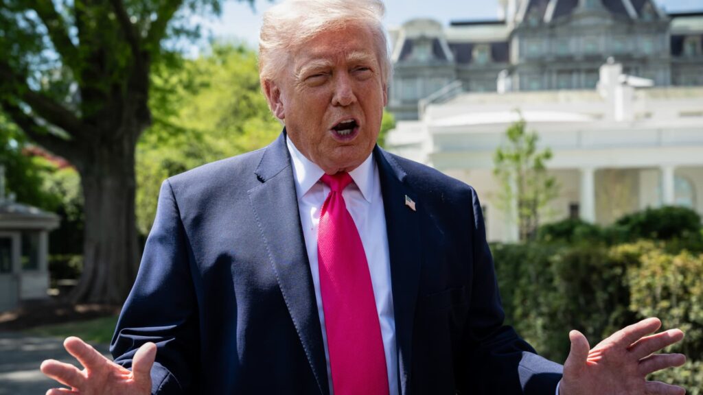 U.S. President Donald Trump speaks with members of the media on the South Lawn of the White House before boarding Marine One on Thursday, April 16, 2026 in Washington, DC, USA.