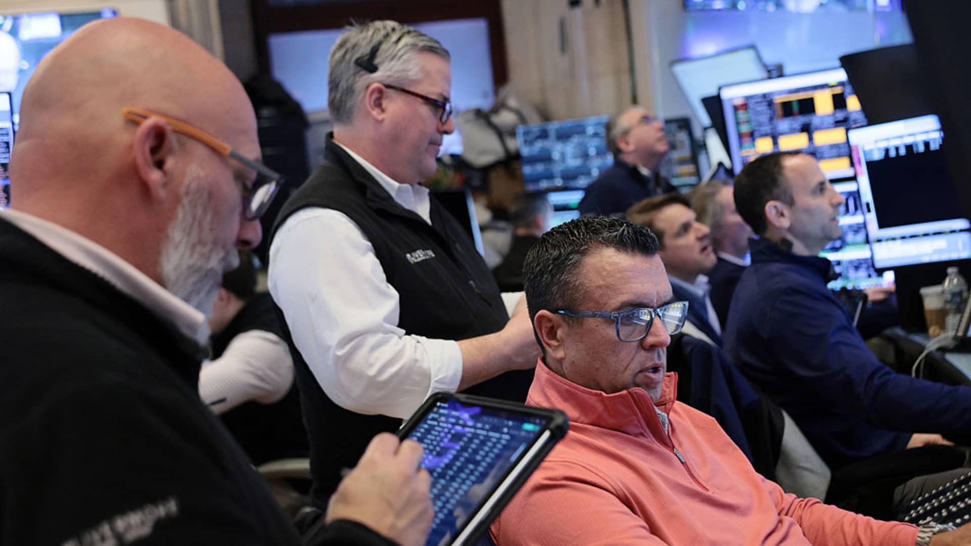 Traders work on the floor of the New York Stock Exchange during morning trading on March 25, 2026 in New York City.