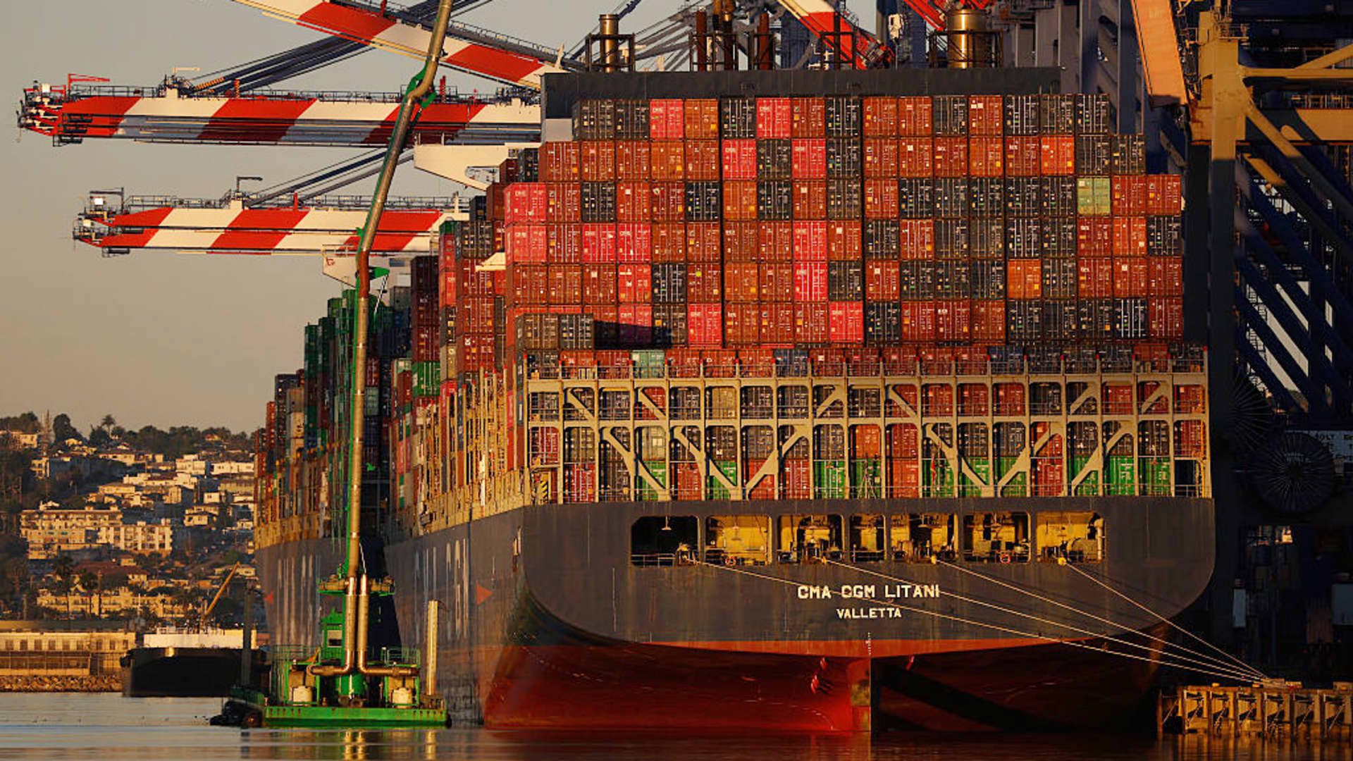 A container ship docks at the Port of Los Angeles on March 13, 2026 in Los Angeles, California.